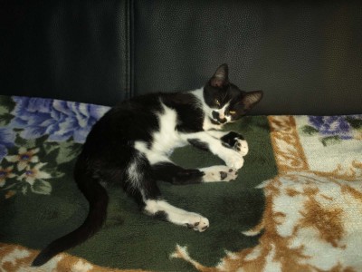 kotka ma około 3 miesięcy jest koloru czarno-białego