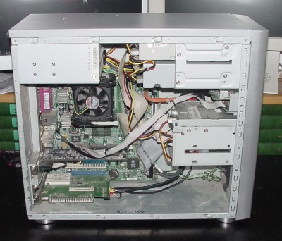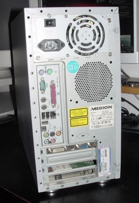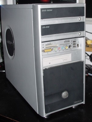 A więc tak, zacznę od tego że sprzedaję bez dysku, nie miałem na co przerzucić danych :wink: Potrzebny dowolny dysk na IDE (ATA). Pecet Mediona, w całkiem fajnej obudowie, płyta główna ma audio 5.1 z we/wy SPDIF. Do tego jak przystało na Mediona przedni panel z masą złączy (3x USB, FireWire, we/wy audio, wejścia Chinch i Svideo, Gameport i czytniki kart pamięci). Na zdjęciach można dostrzec kartę TV, celowo o niej nie wspominałem, gdyż pracuje w PAL B/G (przy odbiorze z anteny nie będzie dźwięku), ale wciąż można ją wykorzystać np do zgrania filmu z magnetowidu przez chinch/svideo :wink: Obudowa ma (chyba) delikatnie podgięty bok - ciężko jest go zdjąć, ale nie widać 'krzywizny'. Sticker XP HE. Na płytce dorzucam nagrane wszystkie potrzebne sterowniki dla XP.