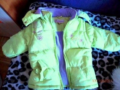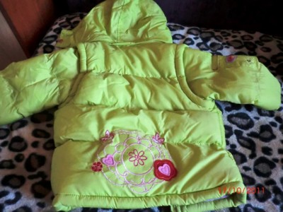 2) Kurtka zielona zimowa, rozmiar z metki to 4, jednak moja córka nosiła ją mając 3lata. Kurtka jest używana, ale jest w stanie bardzo dobrym (nie posiada żadnych zabrudzeń, dziur itd). Jest bardzo praktyczna, można odpinać rękawy, co daje możliwość zakładania jej, jako kamizelki. Ma również odpinany kaptur. Cena 45zł
